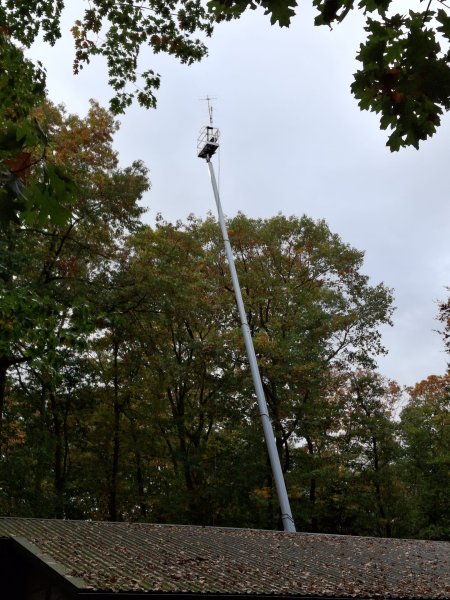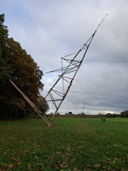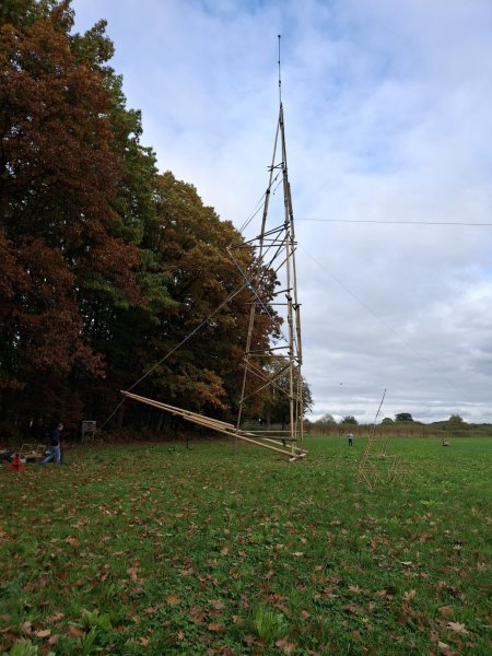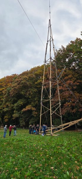Eén van de meest indrukwekkende onderdelen van het weekend was de bouw van een houten toren/mast van maar liefst 30,15 meter hoog. Deze gigantische constructie werd volledig door de scouts zelf gebouwd — met touwen, palen en heel veel teamwork. De opbouw nam een volle werkdag in beslag en was een toonbeeld van doorzettingsvermogen en samenwerking. De toren diende als hoge bevestigingslocatie voor de antennes van het JOTA-station, wat het zendbereik aanzienlijk verbeterde.